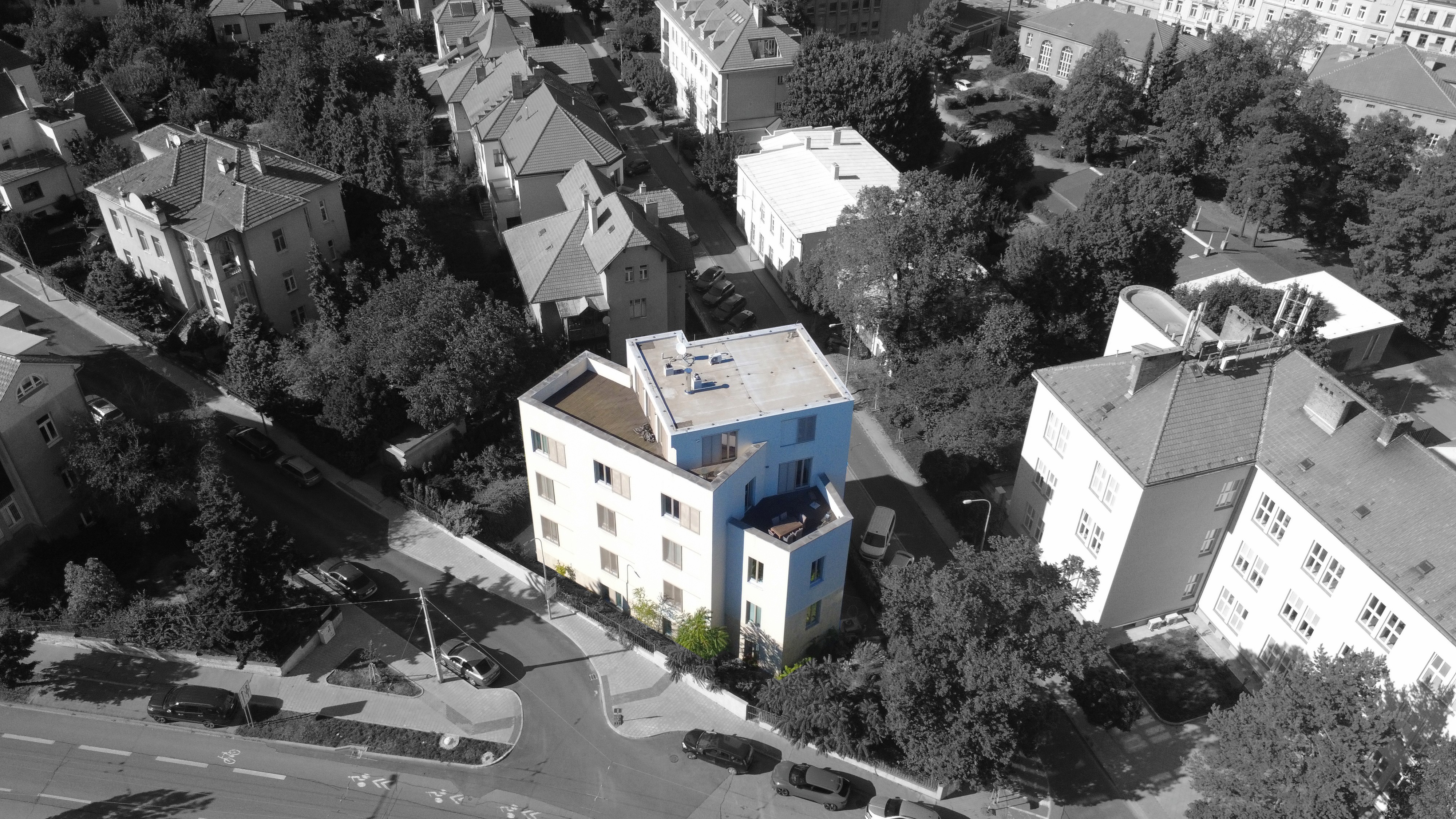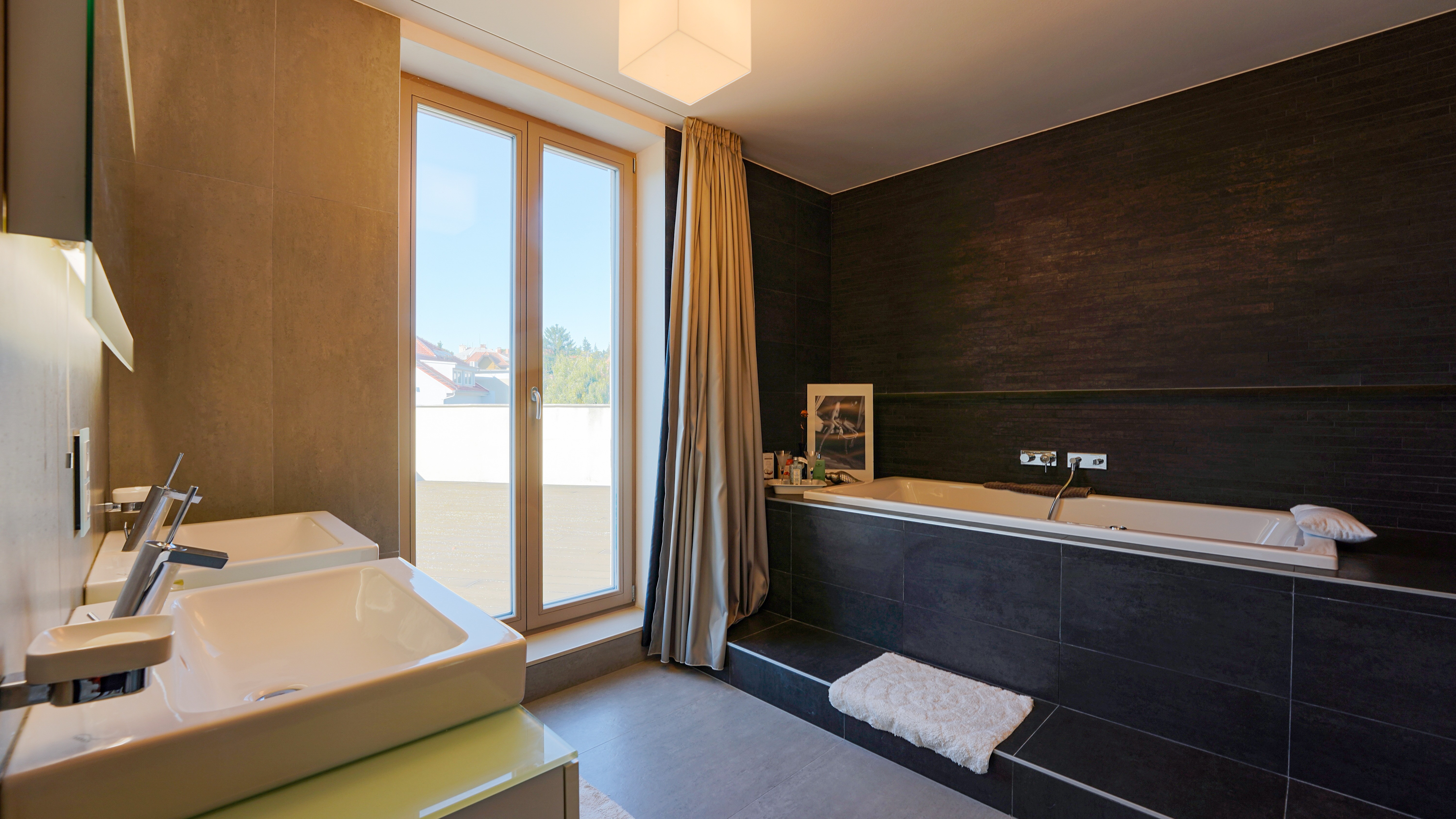Dvě prostorné terasy rozšiřují obytný prostor a nabízejí klid i výhled do okolí. Hlavní terasa navazuje na obývací část, ta horní u ložnice poskytuje naprosté soukromí a večerní atmosféru s výhledem na střechy vil i Špilberk.
